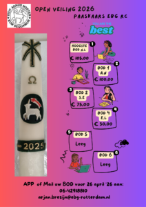 Lieve gemeente EBG Rotterdam Centrum, de Paaskaars van vorig jaar 2025-2026 is te koop. Er zijn vele geïnteresseerden, daarom is door de Oudstenraad besloten de Paaskaars aan de hoogste bieder te verkopen. Sluitingsdatum is 26 april 2026 in de kerkdienst.